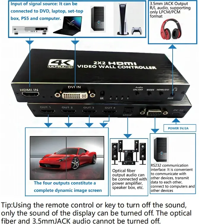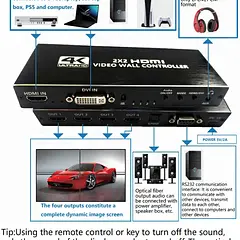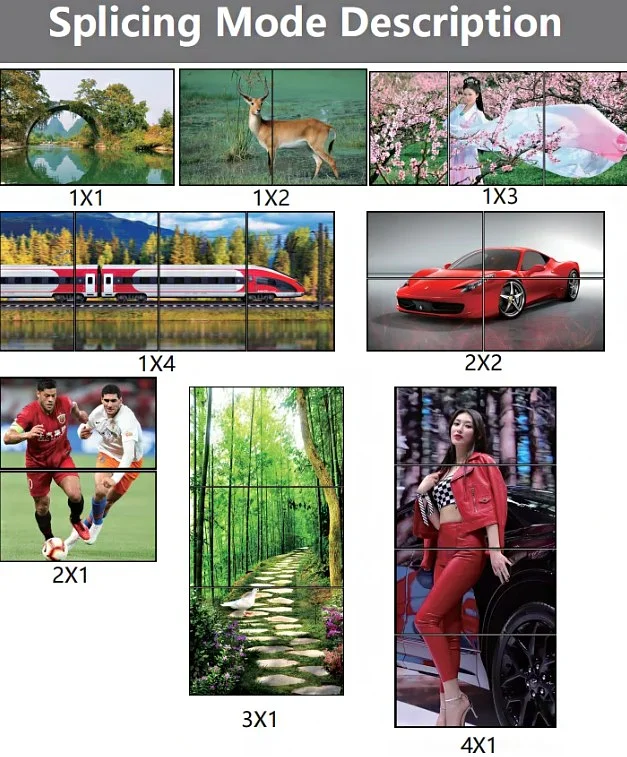 Para formar una gran pantalla de imagen dinámica. Características: múltiples modos de empalme. Admite varios modos de empalme de pantallas, incluidos 2x2, 1x2, 2x1, 1x3 4, 4 x 1, 3 x 1, con una mezcla perfecta y ampliamente compatible con PC, STB, computadoras portátiles, PS3/4, etc.